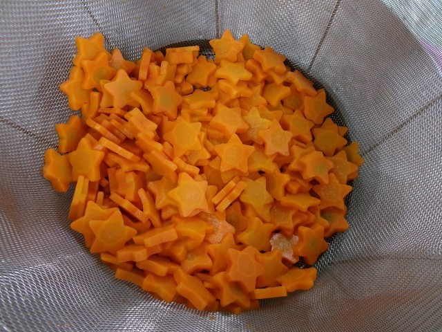 今日の給食は、成増小学校、赤塚第二中学校、成増ヶ丘小学校と3校で同じメニューを提供する「学びのエリア給食」です。今日のカレーライスはシンプルなカレーで、豚肉やじゃがいも、玉ねぎ、人参が入っています。人参は☆型にくり抜いた「ハッピーキャロット」を各クラスに入れています。給食のカレーは全てルゥから手作りです。カレー粉と小麦粉、油とバターで一から作っています。辛さもここの時点で調整しています。1年生にとっては、小学校で初めて食べるカレー、辛さは控えめに作りました。「ハッピーキャロット」が入っていた1年生の児童は「何かいいことあるかなぁ?」と、とても嬉しそうでした。