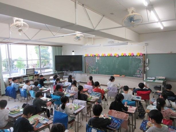 給食は昨日から始まっていますが、1年生にとっては今日が初めての給食でした。先生の話を良く聞きながら配膳をすることができました。初めての給食当番もがんばりました。