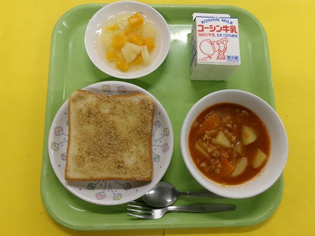 「セサミトースト」は白すりごま、白ごま、グラニュー糖、マーガリンを混ぜ合わせたものをパンに塗った甘いトーストです。パンの耳もしっかり食べてほしいので、硬くならないよう、スチームを入れてしっとりと焼き上げました。「レンズ豆のスープ」は、鉄が豊富なレンズ豆がたっぷり入ったトマト味のスープです。じゃがいもや豚肉も入って具だくさんになっています。給食終了後、1年生の教室に行くと「今日のスープ、めっちゃおいしかった!」と声を掛けてくれました。トマト味のスープはどの学年からも人気があり、完食しているクラスが多くありました。