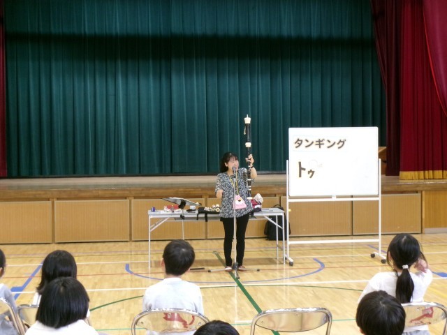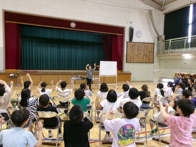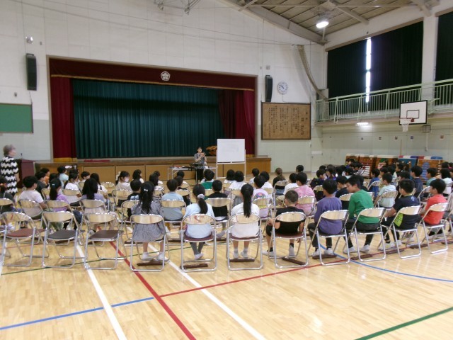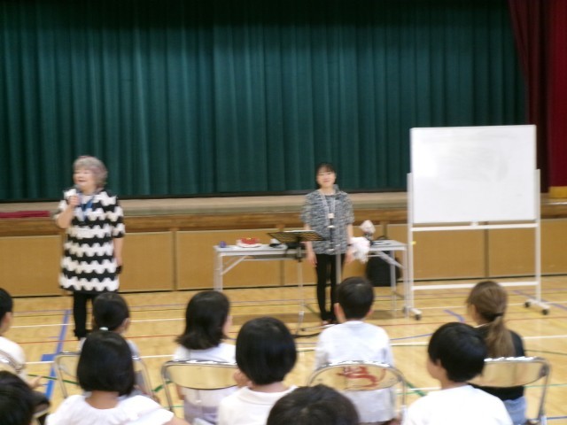 3年生の音楽でリコーダーを習うので、講師の先生を招いた学習を行いました。子どもたちの持っているリコーダーと同じもので流行した曲を弾いていただいたり、リコーダーのいろいろな種類を披露していただいたりしました。子どもたちは姿勢、持ち方、息づかいを丁寧に教わりました。「自分たちにもこんな曲ができるんだ。」「見たことないリコーダーがこんなにあるんだ。」と、次回からの音楽が楽しみになった時間になりました。