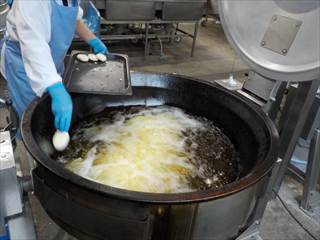 いももちは、人気のメニューです。作り方は、じゃがいもをゆでてつぶし、でんぷんや塩を混ぜます。それを小判型にして油で揚げ、甘じょっぱいタレをかけてできあがりです。多くのクラスで完食していました!