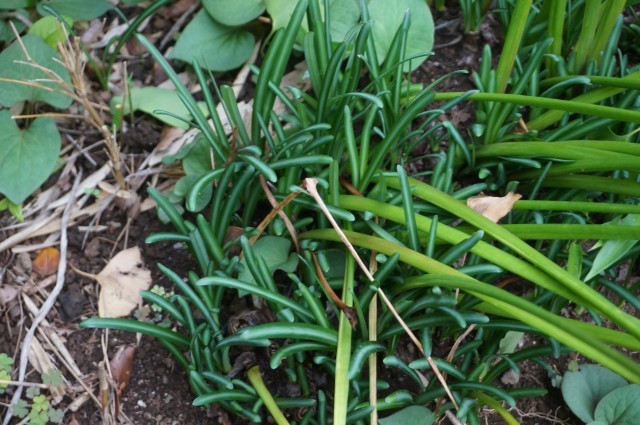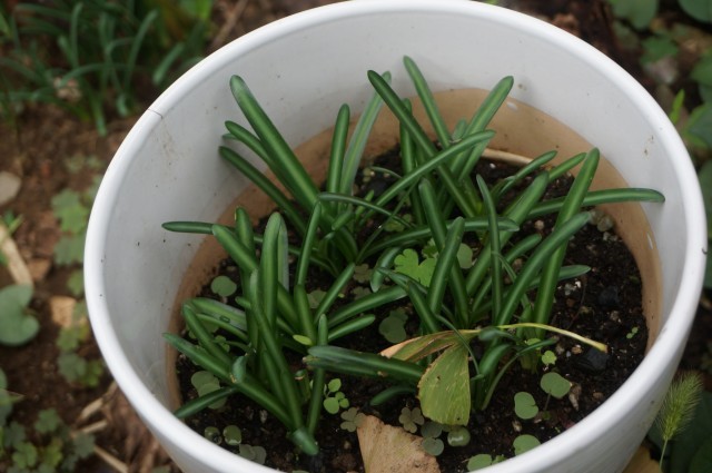 一昨年、球根を掘り出して校内展示用として鉢植えにしたのですが、今年になってついに葉が出てきました。