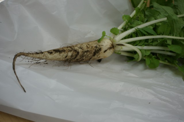 3年生が総合的な学習の時間「しもあか大根研究所」」で育てている江戸東京野菜「亀戸大根」を分けていただきました・