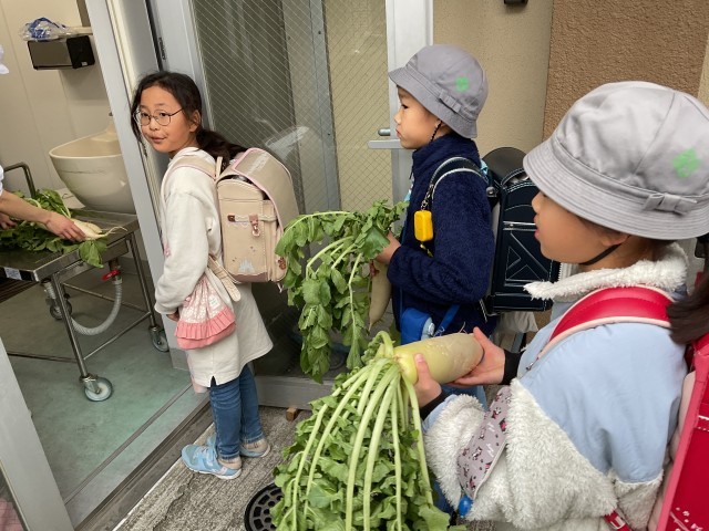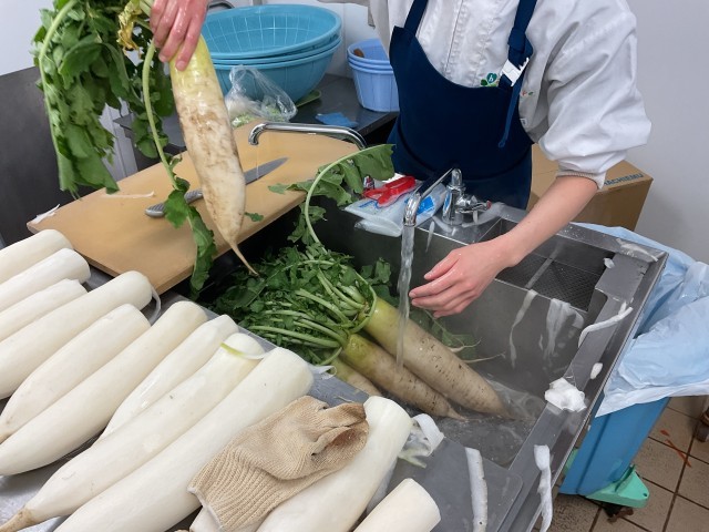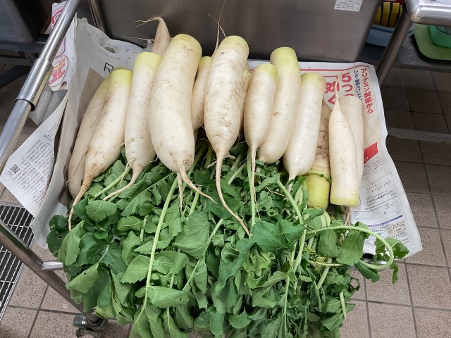 12/4 給食調理の様子1 公開日 2025/12/04 更新日 2025/12/04 給食献立 今日は、3年生が「しもあか大根研究所2025」で育てた大根を使った「カレーライス」でした。今週月曜日と火曜日に収穫し、新鮮なためか、みずみずしい大根でした。