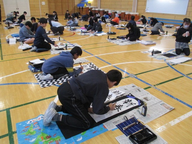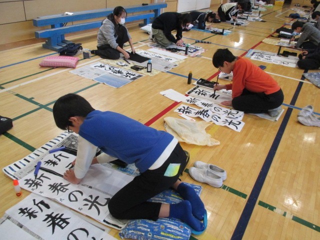 1/13 席書会 5年生 公開日 2026/01/13 更新日 2026/01/13 できごと 本日、席書会を5年生・6年生が実施しました。子供たちは一画一画に心を込め、大変素晴らしい字を書き上げていました。静まりかえった体育館で、書と真剣に向き合う姿からは、これまでの学習の積み重ねと自信が感じられました。高学年らしい力強さと成長がうかがえる席書会となりました。
