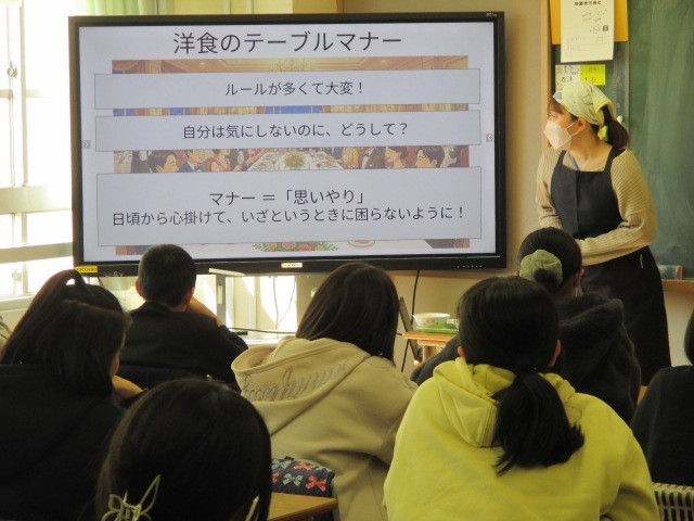 6年生は、これから行う「テーブルマナー給食」にむけて事前の学習を行っています。