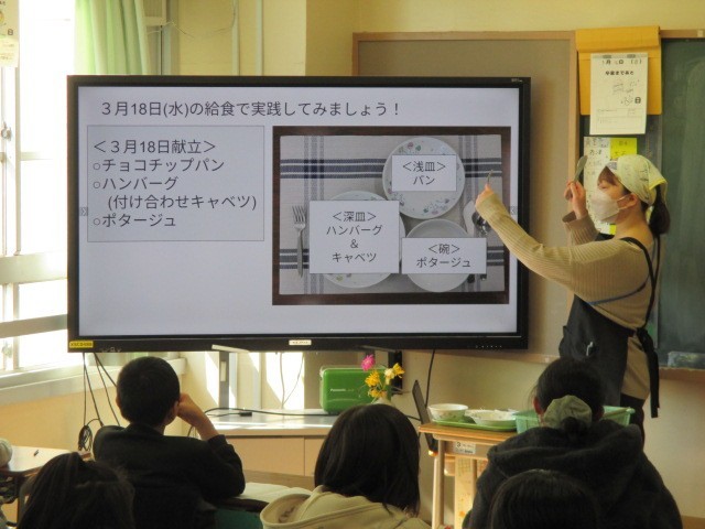 担任と栄養士の先生が、食事の基本的なマナーについて伝えています。