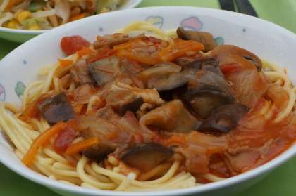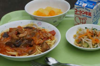 今日の給食 なす入りトマトソーススパゲッティ