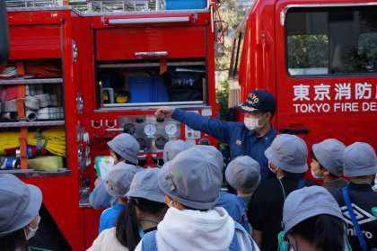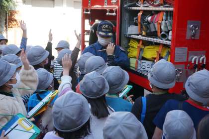 消防車や消防士の装備について、教えていただきました。