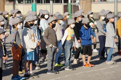 今朝は、校庭でゲーム集会を行いました。 「ハイ チーズ!」ゲーム
