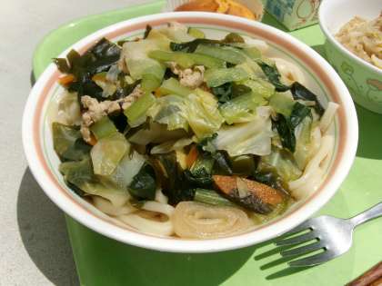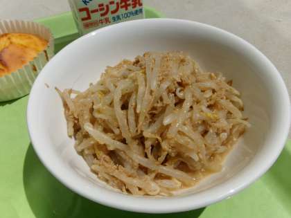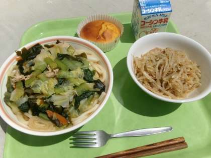 〈献立〉 わかめうどん もやしのごま醤油和え ヨーグルトケーキ 牛乳