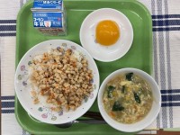今日は下赤塚小人気No.1のキムチチャーハンです。先日家庭科の授業で5、6年生から給食室へのメッセージをもらったのですが、何人か「キムチチャーハンはもっと辛い方が良い」と感想をくれたので、今回は高学年のみいつもより少し辛めに味付けしてみました。