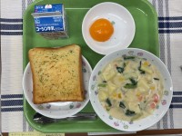 「コーンクリームシチュー」「くだもの(黄桃缶)」
