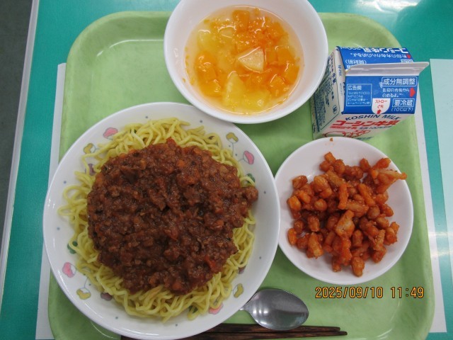 9月10日 公開日 2025/09/24 更新日 2025/09/24 給食 【献立】 牛乳 ジャージャン麺 鉄ちゃんビーンズ サイダーポンチ 【産地】 生姜・・・・・・高知 にんにく・・・・青森 たまねぎ・・・・兵庫 にんじん・・・・北海道 ながねぎ・・・・青森