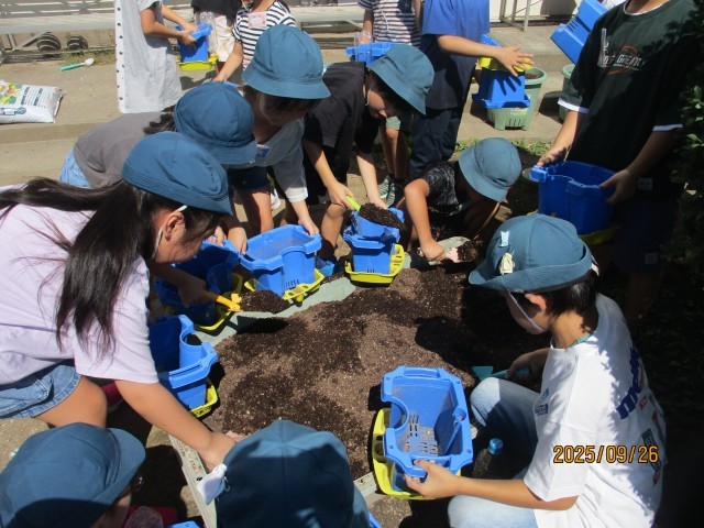 9月26日(金)の3時間目に「かわいい大根」の種まきをしました。大根の種の植え方を教えてもらいながら、保護者の方や地域の方にもお手伝いしていただき、丁寧に植えることができました。冬には育てた野菜でパーティーを行う予定です。そのために、今からコツコツと育てていきます!