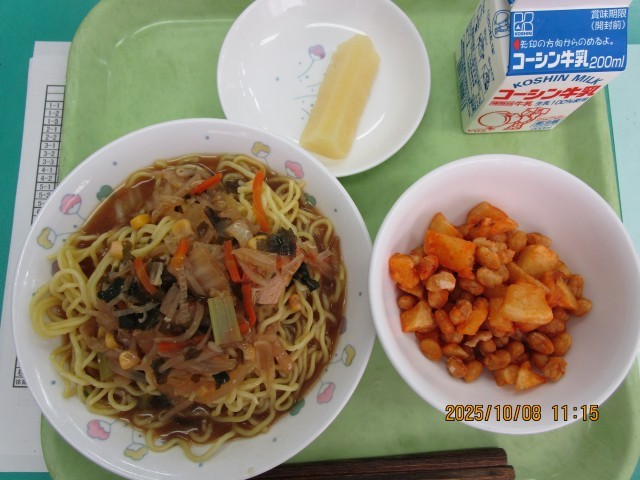 10月8日 公開日 2025/10/25 更新日 2025/10/25 給食 【献立】 牛乳 北海ラーメン 大豆とポテトのフライ くだもの 【産地】 にんにく・・・・・青森 ショウガ・・・・・高知 たまねぎ・・・・・北海道 にんじん・・・・・北海道 もやし・・・・・・栃木 白菜・・・・・・・長野 ねぎ・・・・・・・青森 青菜・・・・・・・茨城 じゃがいも・・・・北海道