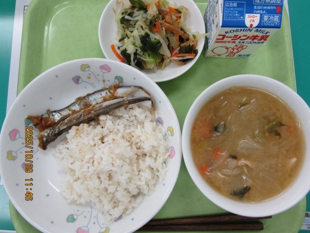 10月9日 公開日 2025/10/25 更新日 2025/10/25 給食 【献立】 牛乳 ごはん ししゃもの南蛮焼き カリカリ油揚げのサラダ 五目汁 【産地】 ねぎ・・・・・・青森 もやし・・・・・栃木 キャベツ・・・・群馬 にんじん・・・・北海道 ショウガ・・・・高知 たまねぎ・・・・北海道 だいこん・・・・北海道 青菜・・・・・・茨城