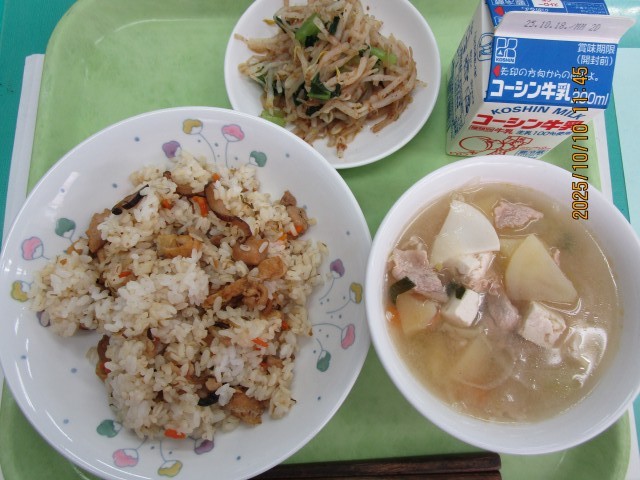 10月10日 公開日 2025/10/25 更新日 2025/10/25 給食 【献立】 牛乳 ジューシー(沖縄風炊き込みごはん) おひたし イナムドゥチ 【産地】 にんじん・・・・・北海道 青菜・・・・・・・茨城 もやし・・・・・・栃木 大根・・・・・・・北海道 じゃがいも・・・・北海道 ねぎ・・・・・・・青森 ちんげんさい・・・静岡