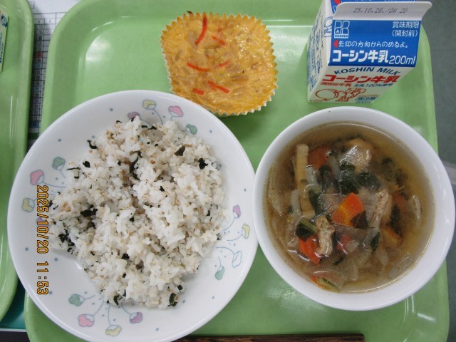 10月20日 公開日 2025/10/25 更新日 2025/10/25 給食 【献立】 牛乳 わかめごはん 和風卵焼き かしわ汁 【産地】 たまねぎ・・・・・・北海道 にんじん・・・・・・北海道 じゃがいも・・・・・北海道 ゴボウ・・・・・・・群馬 だいこん・・・・・・青森 長ネギ・・・・・・・青森 青菜・・・・・・・・茨城