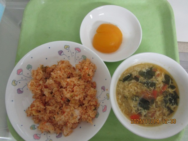 11月19日 公開日 2025/11/28 更新日 2025/11/28 給食 【献立】 牛乳 キムチチャーハン たまごと春雨のスープ くだもの 【産地】 にんじん・・・・・北海道 ピーマン・・・・・群馬 長ネギ・・・・・・青森 もやし・・・・・・埼玉 生姜・・・・・・・高知