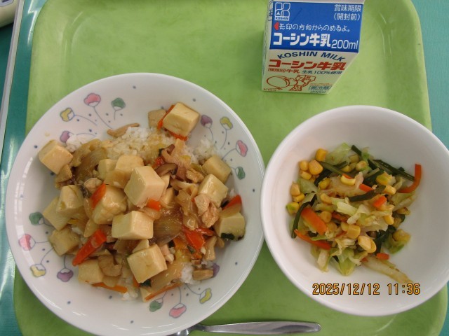 12月12日 公開日 2025/12/24 更新日 2025/12/24 給食 【献立】 牛乳 ごはん 豆腐の中華煮 茎わかめサラダ 【産地】 にんにく・・・青森 生姜・・・・・高知 にんじん・・・千葉 ねぎ・・・・・栃木 たまねぎ・・・北海道 青梗菜・・・・静岡 キャベツ・・・愛知