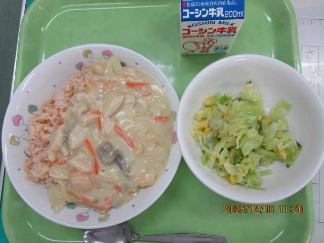 12月18日 公開日 2025/12/24 更新日 2025/12/24 給食 【献立】 牛乳 えびクリームライス 野菜サラダ 【産地】 たまねぎ・・・・・北海道 にんじん・・・・・千葉 きゃべつ・・・・・愛知 きゅうり・・・・・千葉