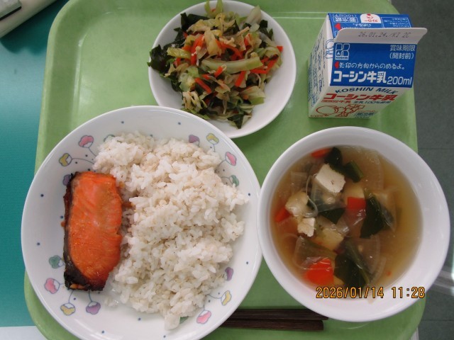 1月14日 公開日 2026/01/16 更新日 2026/01/16 給食 【献立】 牛乳 ごはん 鮭の西京味噌焼き 和風きのこサラダ すまし汁 【産地】 しめじ・・・・・長野 えのき・・・・・長野 キャベツ・・・・群馬 にんじん・・・・北海道 だいこん・・・・青森 長ネギ・・・・・青森 青菜・・・・・・茨城