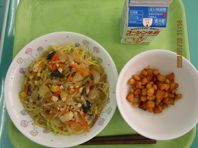 1月16日 公開日 2026/01/21 更新日 2026/01/21 給食 【献立】 牛乳 みそラーメン 大豆とポテトのフライ 【産地】 にんにく・・・・・青森 生姜・・・・・・・高知 たまねぎ・・・・・北海道 にんじん・・・・・北海道 もやし・・・・・・埼玉 白菜・・・・・・・群馬 青菜・・・・・・・茨城 長ネギ・・・・・・青森 じゃがいも・・・・北海道