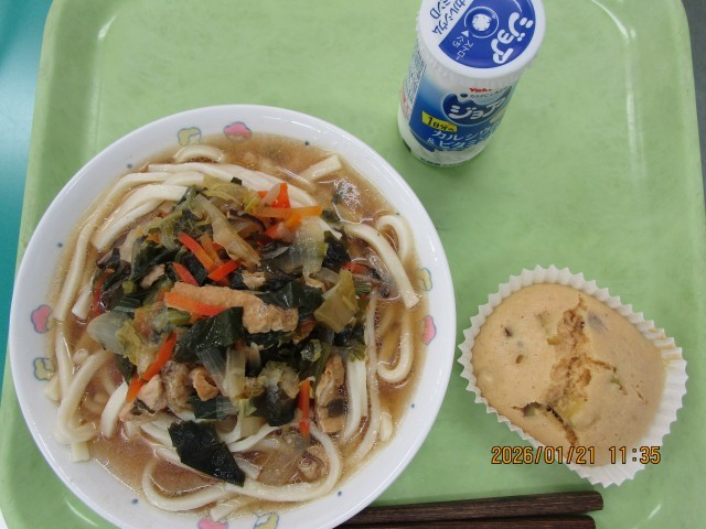 1月21日 公開日 2026/02/02 更新日 2026/02/02 給食 【献立】 ジョア 冬野菜のかけうどん さつまいもの黒糖蒸しパン 【産地】 にんじん・・・・千葉 青菜・・・・・・茨城 長ネギ・・・・・千葉 白菜・・・・・・群馬 たまねぎ・・・・北海道 さつまいも・・・千葉