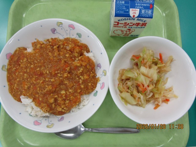 1月28日 公開日 2026/02/02 更新日 2026/02/02 給食 【献立】 牛乳 キーマカレー レモンドレッシングサラダ 【産地】 にんにく・・・・・青森 生姜・・・・・・・高知 たまねぎ・・・・・北海道 にんじん・・・・・千葉 セロリ・・・・・・長野 キャベツ・・・・・愛知 もやし・・・・・・埼玉 大根・・・・・・・神奈川