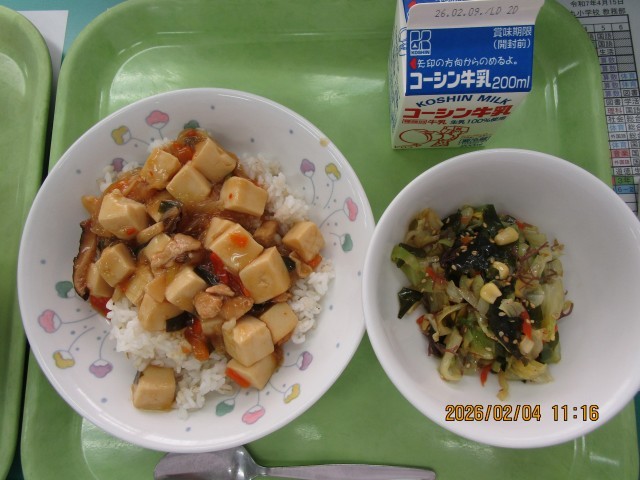2月4日 公開日 2026/03/02 更新日 2026/03/02 給食 【献立】 牛乳 むぎごはん 四川豆腐 海藻サラダ 【産地】 生姜・・・・・・高知 にんにく・・・・青森 にんじん・・・・千葉 タマネギ・・・・北海道 ねぎ・・・・・・千葉 にら・・・・・・茨城 キャベツ・・・・愛知