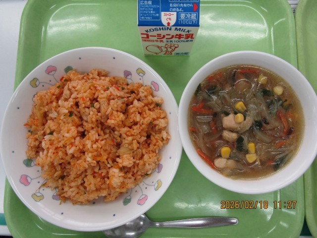 2月18日 公開日 2026/03/02 更新日 2026/03/02 給食 【献立】 牛乳 キムチチャーハン 中華スープ 【産地】 にんじん・・・・千葉 ピーマン・・・・宮崎 生姜・・・・・・高知 たまねぎ・・・・北海道 小松菜・・・・・茨城