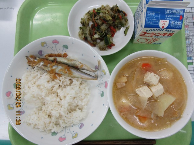 2月25日 公開日 2026/03/02 更新日 2026/03/02 給食 【献立】 牛乳 ごはん ししゃもの南蛮付け いそか和え 豚汁 【産地】 ねぎ・・・・千葉 青菜・・・・茨城 白菜・・・・栃木 にんじん・・千葉 ゴボウ・・・青森 だいこん・・神奈川 じゃがいも・鹿児島 ネギ・・・・千葉