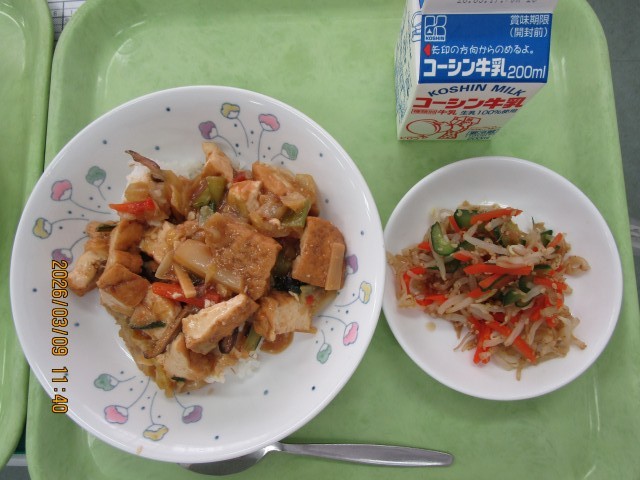3月9日 公開日 2026/03/19 更新日 2026/03/19 給食 【献立】 牛乳 麦ごはん 家常豆腐 もやしときゅうりのごま醤油和え 【産地】 しょうが・・・・・高知 にんじん・・・・・千葉 キャベツ・・・・・愛知 青梗菜・・・・・・茨城 にんにく・・・・・青森 きゅうり・・・・・福島 もやし・・・・・・埼玉