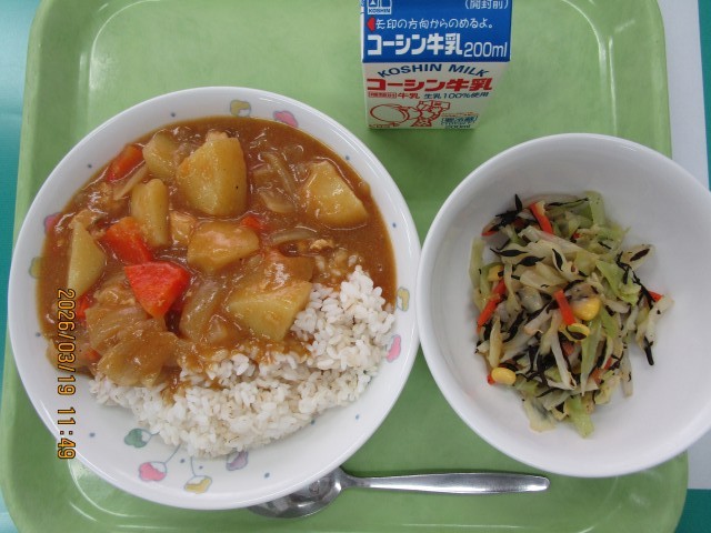 3月19日 公開日 2026/03/26 更新日 2026/03/26 給食 【献立】 牛乳 カレーライス ひじきサラダ 【産地】 にんにく・・・・・・青森 生姜・・・・・・・・高知 たまねぎ・・・・・・北海道 にんじん・・・・・・千葉 じゃがいも・・・・・鹿児島 りんご・・・・・・・長野 キャベツ・・・・・・愛知 もやし・・・・・・・埼玉