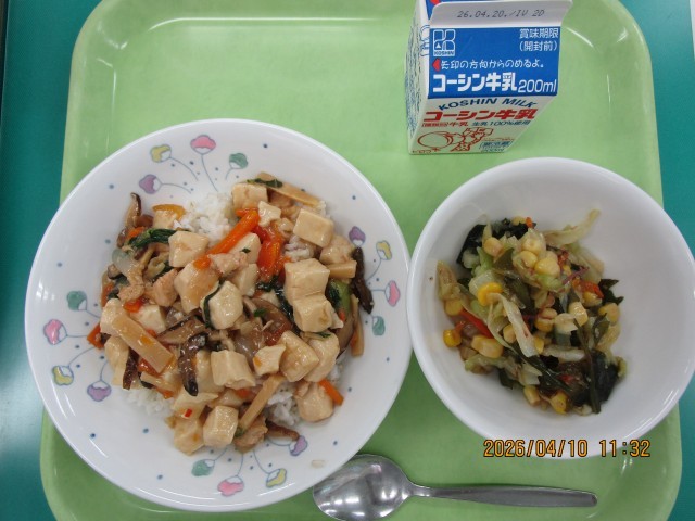 4月10日 公開日 2026/04/22 更新日 2026/04/22 給食 【献立】 牛乳 ごはん 豆腐の中華煮 海藻サラダ 【産地】 にんにく・・・・青森 ショウガ・・・・高知 にんじん・・・・徳島 玉ねぎ・・・・・佐賀 ネギ・・・・・・千葉 ちんげんさい・・静岡 キャベツ・・・・愛知