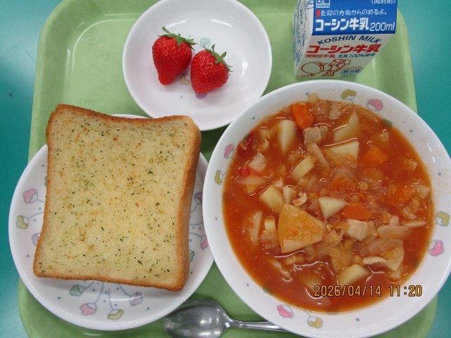 4月14日 公開日 2026/04/22 更新日 2026/04/22 給食 【献立】 牛乳 ガーリックトースト レンズ豆のスープ くだもの 【産地】 にんにく・・・・青森 玉ねぎ・・・・・佐賀 にんじん・・・・徳島 じゃがいも・・・鹿児島 いちご・・・・・茨城