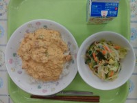 《今日の献立》 牛乳、かわり親子丼、野菜のごま酢《主な食材産地》 牛乳(千葉...