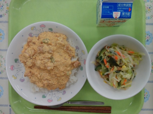 牛乳、あぶたま丼、野菜のにんにく醤油ドレッシング
