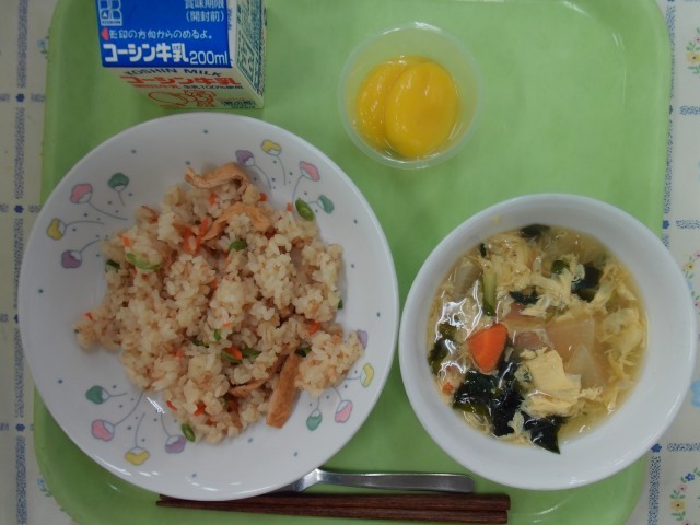 牛乳、こぎつねごはん、かきたま汁、お月見団子
