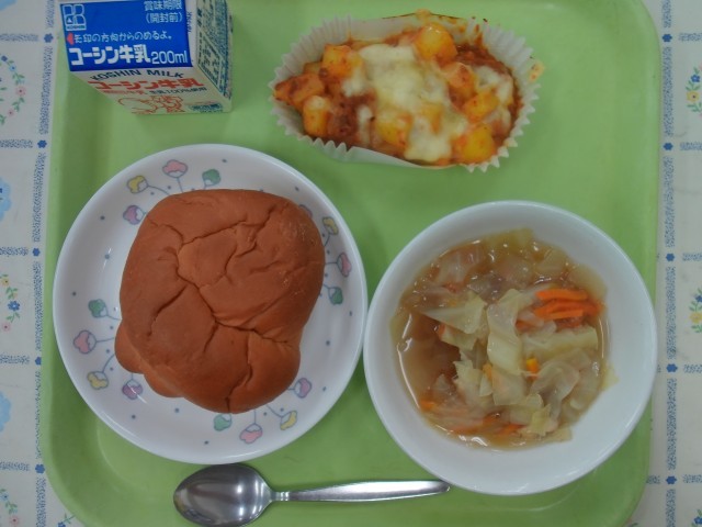 牛乳、黒砂糖パン、ポテトのミートグラタン、白インゲン豆のスープ