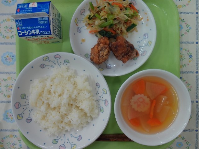 牛乳、ごはん、とり肉の唐揚げ、あまからおひたし、お祝い汁