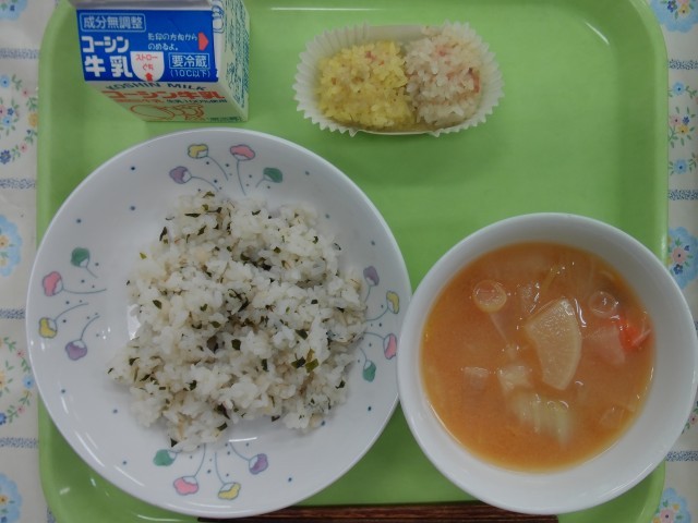 牛乳、わかめごはん、菊花団子、大根のみそ汁