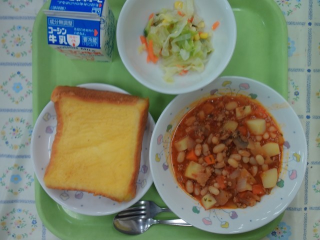 牛乳、フレンチトースト、チリコンカン、コールスローサラダ