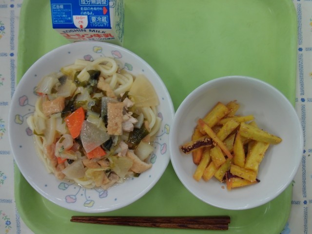 牛乳、あんかけうどん、キャラメルポテト