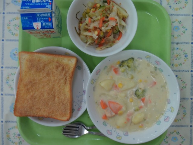 牛乳、セサミトースト、クリームシチュー、サラダ