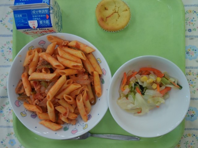 牛乳、ペンネアラビアータ、コーンサラダ、あしたばチーズケーキ