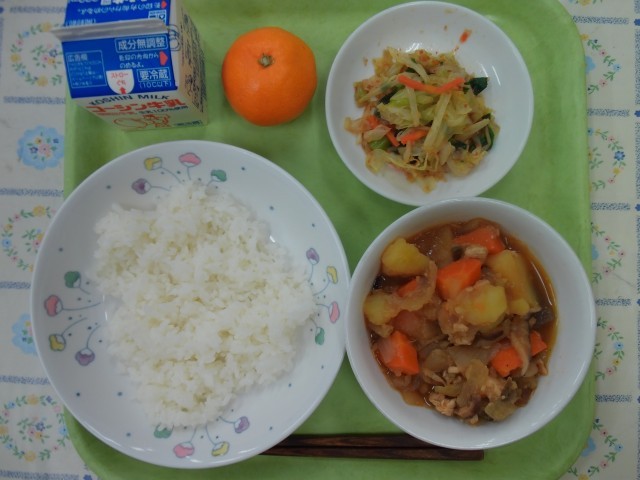 牛乳、ごはん、韓国風肉じゃが、おかかあえ、みかん