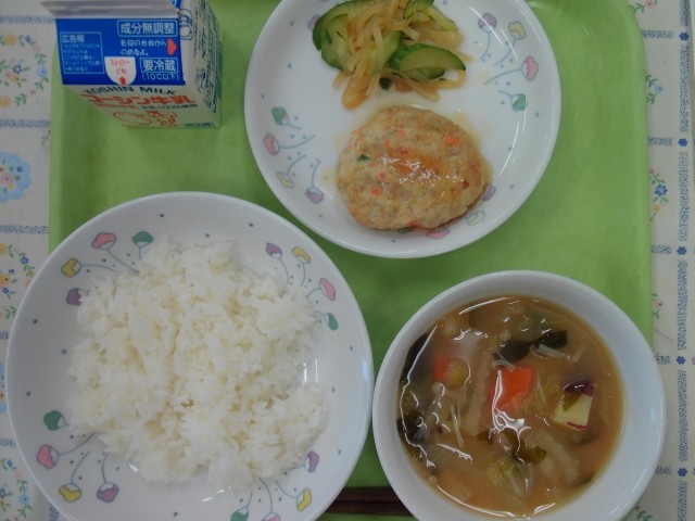 牛乳、ごはん、れんこんのつくねあん、甘酢あえ、わかめ入りみそ汁