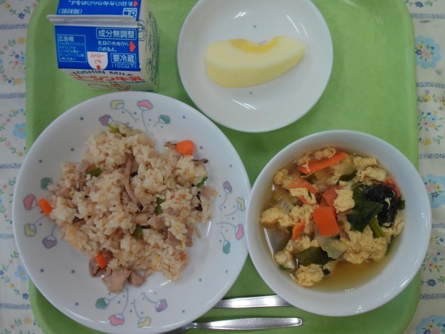 牛乳、焼き肉チャーハン、わかめとたまごの中華スープ、りんご